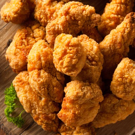 Chicken Popcorn are pieces of chicken that have been breaded and fried.