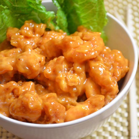 Chicken Chilly prepared using coating chicken in a thick batter and fried unti ...